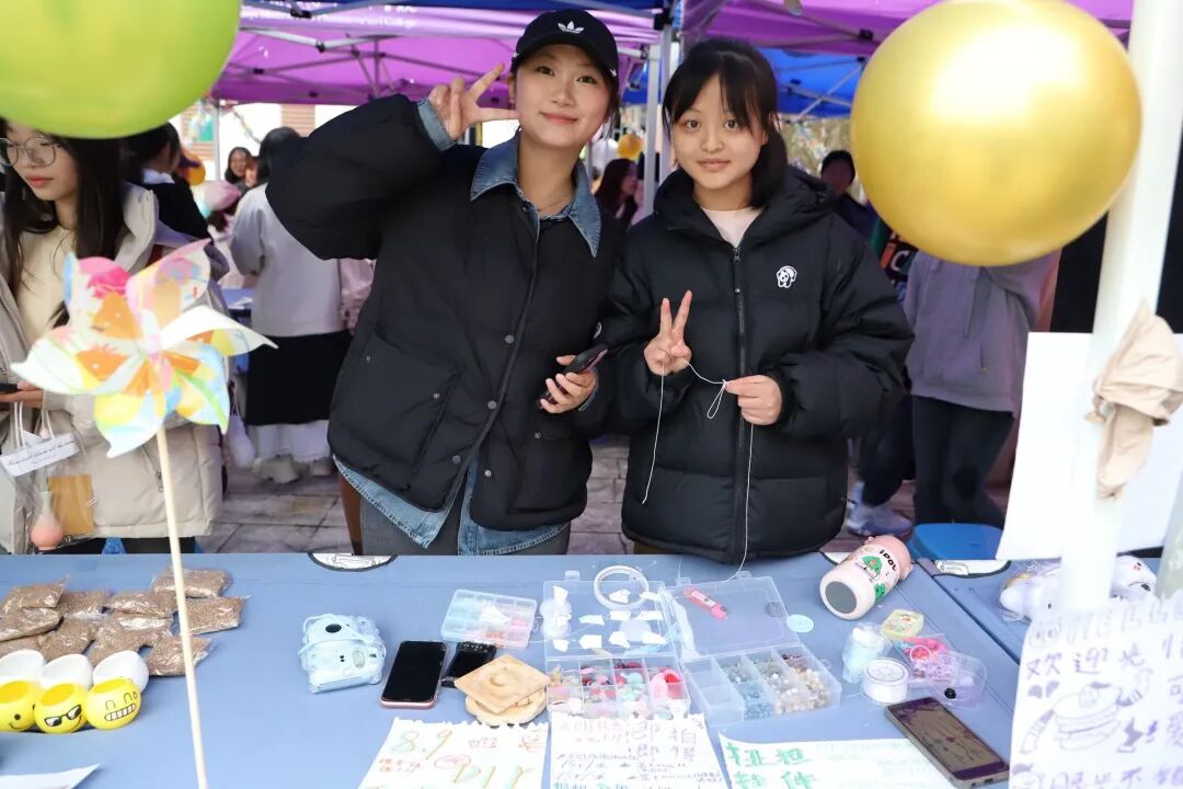 集市作品均由我校各年级同学独立或合作完成,涵盖设计构思至成品售卖全流程,充分展现了同学们的创意与实践能力。现场展售作品种类丰富,包括缠绕灯串的木质小夜灯、绣有校园风景的布艺书签、废旧纸箱改造的创意收纳盒以及黏土捏制的萌趣动物摆件等。每件作品都独具巧思,吸引了大量同学驻足选购。