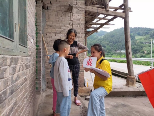 2019年7月6日,推普服务队到达了遵义市习水县土城镇青杠坡村。推普工作并没有队员们之前想的那么轻松,刚开始村民们并不接受我们的访问,所幸的是服务队在第三户村民家找到了突破口,这是一个只有两位老人和两名小孩组成的家庭。两位老人在了解队员们的来意后表示欢迎,并告诉服务队员们小朋友的父母亲均外出务工,一直跟随爷爷奶奶在家乡生活。通过与小朋友进行简单的交谈后,原本羞怯的孩子逐渐大方起来用方言说到:“我今年8岁了,在上二年级,弟弟在上幼儿园。”队员们便拿出随身携带的推普知识手册为两位老人进行推普脱贫相关政策的宣传并使用“常用普通话情景句子”彩色卡纸向两位小朋友教学文字及纠正发音,让他们认识到普通话的重要性。
