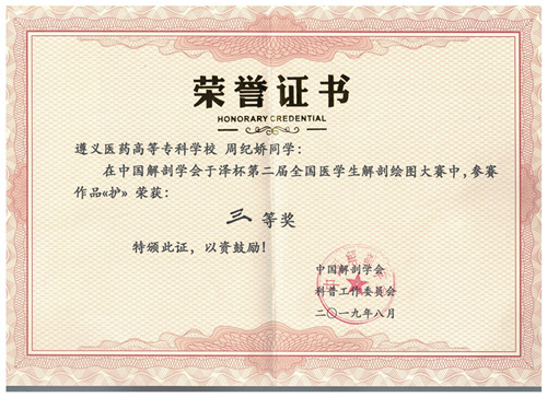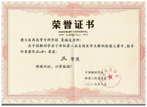中国解剖学第35届(2019)学术年会海峡两岸暨港澳解剖学青年科学家论坛2019年8月18日-21日在云南省昆明市云安会都会议中心举行,会议同时举行了中国解剖学会于泽杯第二届全国医学生解剖绘图大赛,我校社团学生科技社会周纪娇同学作品《护》在此次比赛中荣获三等奖。基础部夏福友老师担任作品指导老师。